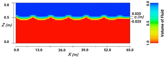The wavelength = 10 m is considered, which is 20 times the depth ( + = 0.5 m). The resulting period of the shallow-water waves is = 4.588 s ( = rad/s). The time-step size is selected as = . The total simulation time is 20, and the starting time of sampling is set to = 7.