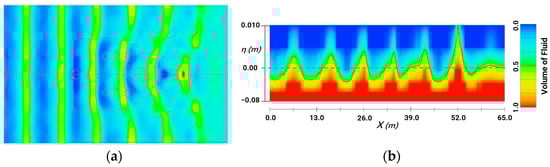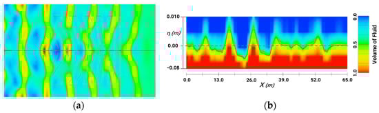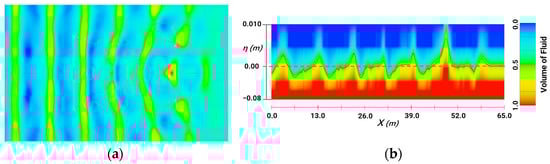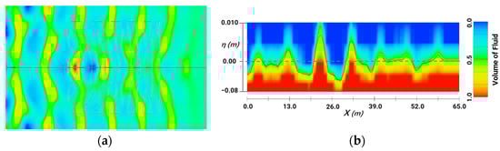 Results of the third simulation case for timestep t = 65.01 s: (a) wave field of surface elevation; (b) surface elevation in the center vertical plane.