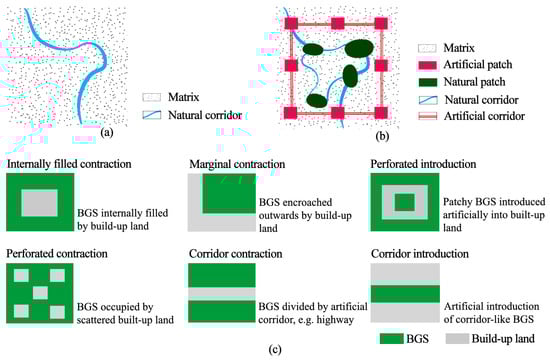 Landscape ecology identifies natural or anthropogenic disturbances as the primary causes of spatial patterns across different scales. Before urbanisation, the BGS was primarily a continuous background structure. Later, the expansion of construction land led to the reduction, division, perforation, disappearance, and fragmentation of the BGS, forming space patches of different scales. Forman, an ecologist, proposed the “patch-corridor-matrix” model [31]. The matrix is the most extensive space, mainly in large agricultural ponds. Patches and corridors are embedded in the matrix [29,31]. On the one hand, a patch refers to a spatial unit that differs from the surrounding environment and displays a certain internal homogeneity. Patches serve as BGS that accommodate and eliminate rainwater, such as wetlands, woodlands, urban green spaces, and rural settlements. On the other hand, corridors are linear or band-like structures that differ from the adjacent environment and mainly consist of BGSs along rivers and their banks. Some scholars applied this model to construct ecological conservation networks [32] and rainwater safety patterns [33]. Therefore, it is evident that this model is appropriate for describing the spatial pattern of the BGS. In conclusion, the “patch–corridor–matrix” model provides a “spatial language” to describe the spatial dynamics of BGS and facilitate time-based comparisons. Based on existing studies, the evolution of the BGS is summarised as marginal contraction, internally filled contraction, perforated contraction, perforated introduction, and corridor cutting, which are determined by the interactions between the patch, corridor, and matrix (Figure 1).