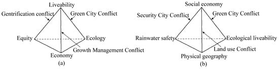 Application of the “sustainability prism” model: (a) “Sustainability prism” model in land use planning; (b) Application of “sustainability prism” model in the driving factors of BGS.