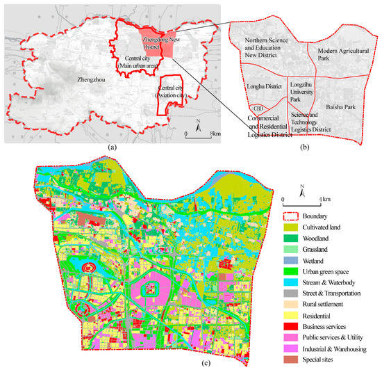 The basic information of Zhengdong New District: (a) Geographical location; (b) Functional zoning; (c) Current land-use in 2021.