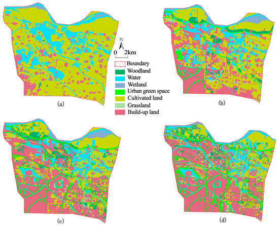 This study selects four study years: 2003, 2009, 2015, and 2021. Among them, 2003 marks the beginning of new area construction, 2009 serves as the base year of the Zhengbian New District Master Plan (2009–2020), and 2021 represents the current situation. Before 2003, the land primarily comprised cultivated land and water, accounting for approximately 85.40% of the total area, with the built-up area mainly consisting of villages. The “Zhengdong New District Overall Development Concept Plan” specifies that the construction of the CBD and the southern commercial and residential logistics space began after 2003. The starting area (CBD) and the commercial and residential logistics areas began construction after 2003. From 2009 to 2015, the new area displayed a multi-point-driven construction state, especially in the Longhu District and Baisha Park. During this period, the BGS was occupied by cultivated land, and forests expanded considerably, leading to increased water in Longhu Lake and Longzi Lake. From 2015 to 2021, the BGS in other clusters has been extensively developed, except for the Modern Agricultural Park, which still retains natural features such as pits and cultivated land (Figure 4).