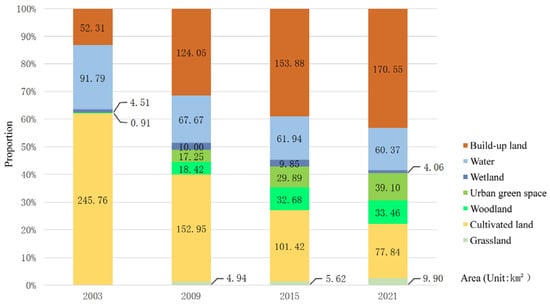 Area and proportion of each land type from 2003 to 2021 in Zhengdong New District.