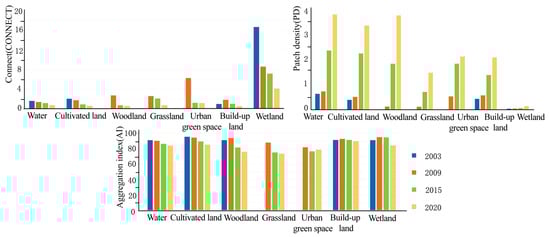According to the AI results, the AI of cultivated land, water, and grassland decreased from 2003 to 2021, indicating that the patches were more dispersed and consisted of more small patches. The AI of woodlands and wetlands increased and then decreased, demonstrating the tendency of aggregation and then dispersion. Urban green space fell from 81.6 in 2009 to 77.0 in 2015, while PD increased significantly from 0.5 in 2009 to 1.8 in 2015, illustrating greater urban green space diffusion during this period. From 2015 to 2021, the AI and PD of urban green spaces increased, indicating that urban green spaces evolved more in aggregation than diffusion forces. These evolutions contributed to a more balanced spatial distribution. From 2003 to 2021, the AI of the built-up land first increased and then decreased. Construction land presented a clustered distribution from 2003 to 2009 and then trended to a dispersed distribution with small patches in the following two periods.