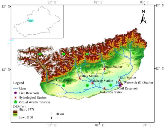 The upstream area of the Weigan River outlet (Figure 1) is located in the Baicheng Basin in the Aksu region of Xinjiang, connected to the middle of the southern foothills of the Tianshan Mountains in the north and adjacent to the Queletage Mountains in the south, with a geographical location between 80°15′~83°02′ E and 41°31′~42°39′ N, covering an area of 16,792.56 km2. The overall topography of the study area slopes from northwest to southeast, with elevations ranging from 1100 to 6778 m. The Weigan River is a typical dry inland glacial snowmelt recharge river. According to the Glacier Catalogue of China, 853 glaciers with a total area of 1783.86 km2 are distributed in the upper headwater area of the Weigan River, and the river runoff exhibits clear seasonal changes due to the influence of glacial meltwater [20]. The five tributaries (Muzati River, Kapuslang River, Tylervichuk River, Karasu River, and Heizi River) in the area are distributed in the shape of a comb, and each tributary flows from north to south and from west to east, along the southern edge of the Baicheng Basin to the southeast corner of the basin near the Kizil Thousand Buddha Cave [21]. Here, it is called the Weigan River after gathering out of the mountains and passing southward through the southern edge of the basin in the Queletage Mountains [22], and finally flowing to the northern edge of the Tarim Basin through the Weigan River Canyon. Before the construction of the Kizil Reservoir, the hydrological station of the Kizil Reservoir was located 3 km above the dam site of the Kizil Reservoir. In 1985, construction officially started on the Kizil Reservoir; the hydrological station of Heizi Reservoir was moved down to 1 km below the cross-section of the dam site and named Heizi Reservoir (II) Station. In August 1991, the main project of the reservoir was completed and water storage operations began. The Kizil Reservoir de-risking and strengthening project started in 2009, and the highest reservoir storage level has gradually transitioned to the designed storage level of 1149.57 m after de-risking and strengthening [23], which has greatly reduced the flood control pressure in the downstream cities and counties of Kuche, Xinhe, and Shaya [24].
