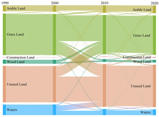 Land use status and interannual transfer changes in the upper reaches of the mountain pass of Weigan River from 1990 to 2020 based on remote sensing.