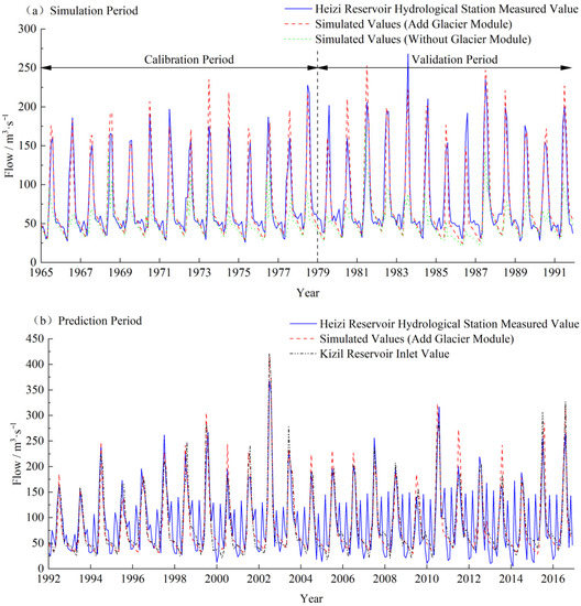 From the annual runoff simulation results (Figure 5a), it can be seen that the overall trends in the simulated and measured values were generally the same during the simulation period, except for 1985 and 1986, when the simulated values were lower than the measured values at the Heizi reservoir hydrological station. In the prediction, although the simulated values without human activities were consistent with the overall runoff trend in the measured values, the model simulated runoff from 1994 to 2001 was lower than the measured runoff by 4.91 × 108 m3 per year. If the simulated runoff without human activities was compared with the incoming runoff from the Kizil Reservoir, the average annual deviation between the two was only 1.21 × 108 m3, and the relative error did not exceed 5%. This indicates that the runoff from the mountain without human activities predicted in this study had a high degree of confidence. Meanwhile, comparing the runoff from the Weigan River before and after the presence of human activities, the annual average increase in incoming water from 1992 to 2016 compared with 1965 to 1991 was 2.99 × 108 m3, and the quantitative separation showed that the increase in runoff caused by precipitation was 1.24 × 108 m3, accounting for 41.45% of the increase in incoming water; the increase in runoff due to glacial melt caused by temperature rise was 1.75 × 108 m3, accounting for 58.55%. This shows that under global climate change conditions, the increase in runoff due to temperature rise was predominant in the study area.