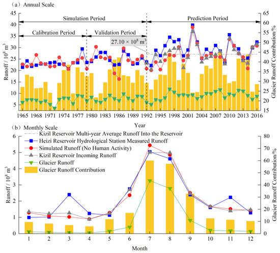 Annual scale (a) and monthly scale (b) simulation predictions of mountain runoff and glacier runoff contributions.