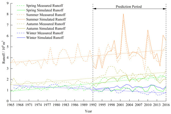 The measured data from the Heizi reservoir hydrological station showed an increasing trend in runoff from the upper reaches of the Weigan River from 1965 to 2016 in spring, summer, and autumn, and a decreasing trend in winter. The Weigan River outflow runoff was mainly concentrated in summer, and according to the simulation results of the natural outflow runoff, incoming water in the summer accounted for 51.06% of the annual accumulation of water. The response of the runoff from the Weigan River to the artificial regulation of reservoir storage was analysed by comparing the measured and model simulated predictions from 1992 to 2016 at the Heizi Reservoir (II) station (Figure 6). The cut-off year between natural runoff and runoff influenced by artificial regulation was 1992, and the simulated natural runoff in summer and spring was greater than the measured runoff influenced by artificial regulation after the reservoir began storing water. The analysis shows that, under the influence of artificial regulation, the multi-year average runoff values in summer and winter were 0.15 × 108 m3 and 0.41 × 108 m3 greater than the simulated natural runoff, accounting for 3.33% and 7.08% of the natural runoff in summer and winter, respectively. However, comparing the simulated natural runoff in spring and autumn with the measured runoff affected by the artificial adjustment, we found that the simulated natural runoff in spring and autumn was lower than the measured runoff affected by the artificial adjustment, and the natural outflow in spring and autumn was increased by an additional 0.92 × 108 m3 and 0.49 × 108 m3, respectively, after the artificial adjustment, which accounted for 83.28% and 24.36% of the natural outflow in spring and autumn, respectively. This shows that the degree of impact of the construction of the water conservation project on natural runoff in spring and autumn was greater than its impact on natural runoff in summer and winter.