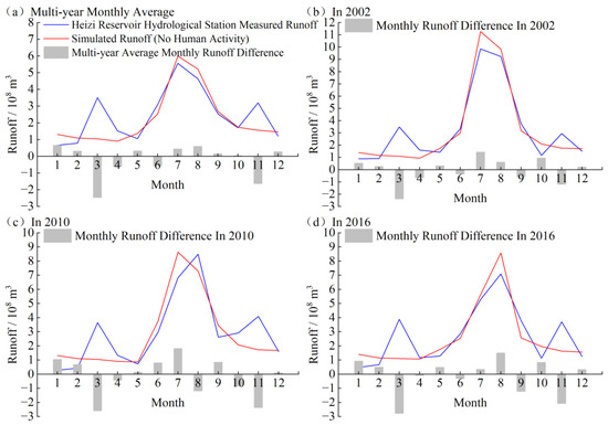 To further analyse the impact of the construction of water projects on the intra-annual distribution of runoff, the simulated runoff was compared to the measured runoff at Heizi Reservoir (II) station (Figure 7a). It can be seen that the simulated values in March and November were significantly lower than the measured runoff values, while the simulated runoff in the rest of the months exhibited less deviation from the measured runoff, and the overall trend was basically the same. The reason for this is that in August 1991, the Kizil Reservoir started to store water, and the artificial storage of the reservoir, such as storage at the end of the flood and replenishment during the dry period, made the actual measured runoff in March and November at the Heizi Reservoir (II) station higher than the incoming runoff from the Kizil Reservoir. The flood season of water coming from the outlet of the Weigan River also increased from July and August to March, July, August, and November, solving the problem of insufficient spring irrigation in March and pressurized saltwater resources for winter irrigation in November for the irrigation areas downstream of the Weigan River. At the same time, an average of 2.74 × 108 m3 more water was impounded annually, and 5.28 × 108 m3 more water was regulated across seasons through storage than before the reservoir was built. Since the reservoir was built and started storing water, the Kizil Reservoir has held the equivalent of a 10-year flood 13 times, the equivalent of a 40-year flood once (“1 August 2016” flood peak flow 3420 m3·s−1 [35]), and the equivalent of a 100-year flood twice (“23 July 2002” flood peak flow 3677 m3·s−1 [21] and “29 July 2010” flood peak flow 3360 m3·s−1 [36]). After the construction of the reservoir, the actual measured runoff from the Heizi Reservoir (II) station, compared with the simulated runoff values without human activities (Figure 7b–d), the temporal distribution of water resources increased by an additional 0.92 × 108 m3, 2.04 × 108 m3, and 1.62 × 108 m3 of water in 2002, 2010, and 2016, respectively, which strongly alleviated the problem of the uneven temporal distribution of water resources.