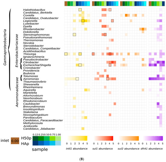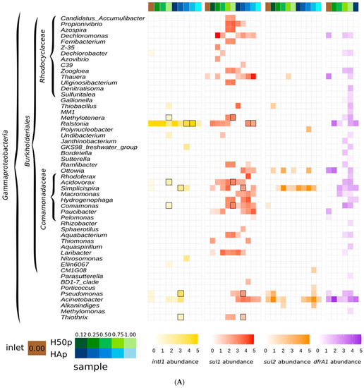 In addition, we found seven taxa of the gammaproteobacterial order Pseudomonadales, including Pseudomonas, carrying the AMR indicator genes in the wetlands (Figure 1A). Numerous Pseudomonas spp. strains carrying class 1 integrons have been described in the literature, and respective isolates were obtained from HAp and H50p throughout the flow path [28]. All four genes were also found in association with Acinetobacter (family Moraxellaceae). Acinetobacter spp. are ubiquitous in environmental habitats as well as in animals and humans, and can cause various diseases [54]. Etiological species include A. baumannii, a member of the ESKAPE group, which are six virulent and antibiotic-resistant bacterial pathogens that cause critical nosocomial infections [55]. There are numerous sequenced Acinetobacter spp. isolates with dfrA1 and sul resistances genes and class 1 integrons [56,57,58,59]. Our findings are in line with the notion that the environment is a substantial reservoir of antibiotic-resistant Acinetobacter spp. [54].