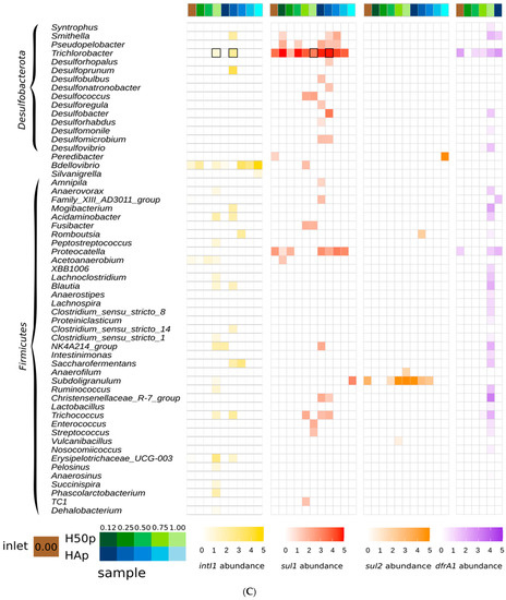 There were also epicPCR fusion products of sul1 and dfrA1 with 16S rRNA fragments of methanogenic Archaea in three samples (H50p at fractional length 0.12 and 1.00, and HAp at fractional length 0.12). Specifically, the sul1 products were linked with 16S rRNA fragments of Methanocorpusculum and Methanospirillum, and the dfrA1 product linked with a 16S rRNA fragment of Methanobacterium, all of which are members of the Methanobacteriota. Genes coding for tetrahydrofolate-synthesizing enzymes were discovered in some methanogenic Archaea [66], but the amino acid sequence identities are only around 30–40% of the products of sul1 and dfrA, and we have not found closer homologs in the sequenced archaeal genomes of GenBank and PATRIC [67]. We note that the epicPCR results need to be corroborated, since there were only three samples were positive for fusion products with archaeal 16S rRNA gene amplicons and only <20 reads each. Nevertheless, our findings are first evidence for inter-domain transfer of sul1 and dfrA1 into members of the Archaea. Horizontal transference between Archaea and Bacteria has been suggested for multiple other genes [68,69,70]. Furthermore, integrons, although not of the class 1 type, were recently discovered at a low frequency in metagenome-assembled genomes (MAGs) of Archaea, including members of the Methanobacteriota [71]. In the same study, it was shown that class 1 integron integrase harbored by an E. coli strain could incorporate archaeal gene cassettes into its integron via the archaeal attC recombination site. It is reasonable to hypothesize that archaeal integrase can incorporate bacterial gene cassettes, possibly taken up via transformation [72], into archaeal integrons, which could explain the apparent presence of sul1 and dfrA1 in the methanogenic Archaea observed here. Future epicPCR analysis could employ primers specifically targeting the archaeal 16S rRNA gene.
