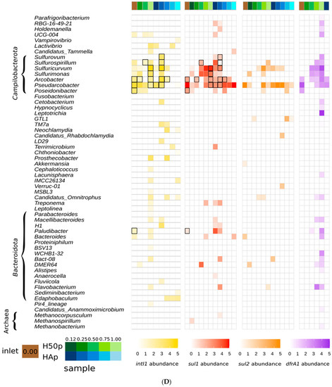 Genera detected as hosts of intI1 (yellow squares), sul1 (red), sul2 (orange), and dfrA1 (purple) in samples from the common inlet (brown) and the two treatment wetlands H50p (green) and HAp (blue). Relative abundances are Log10 normalized (Roman et al., 2021), indicated per color intensity. (A) Hosts belonging to the Gammaproteobacteria, including members of the families Rhodocylaceae and Comamonadaceae. (B) Further hosts belonging to the Gammaproteobacteria and other Proteobacteria. (C) Hosts belonging to the Desulfobacterota, Bdellovibrionota, and Firmicutes. (D) Hosts belonging to the Campylobacterota, Bacteroidota, and Archaea.