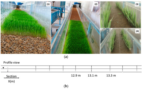 (a). Experimental set up showing: (1 and 2) Wheat sprout canopy; (3 and 4) Wheat stems on bank. (b). Measured velocity points of experimental set up, at the distance of 12.9, 13.1, 13.3 m from the entrance of the channel.