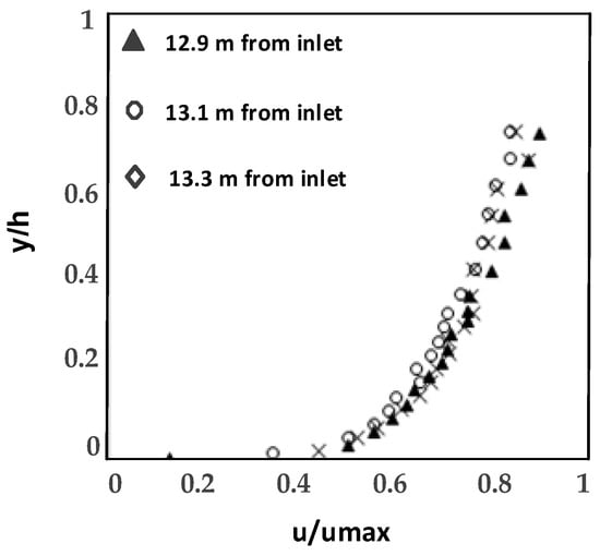 Although the gravel bed from the entrance to x = 11.5 m prompts the fully developed flow in the flume (Figure 2), the variation of bed roughness from gravel to vegetation cover (wheat stems) causes the development of a new boundary layer. Figure 2 reveals that after x = 12.9 m from entrance of the flume in this experimental set up, the new boundary layer reaches a fully developed condition where flow velocity profiles are similar at different distances from the leading end of the flume (where water enters to the flume). The horizontal axis shows the mean point velocity (u) normalized by the maximum velocity () in each profile, and y/h shows the flow depth at each point from the bed (y) normalized by total flow depth (h). Therefore, all results for this experimental set up are presented after x = 12.9 m from the channel entrance. Some deviations from unique curves are observed in Figure 2, which may be ascribed to some uncertainty associated with the definition of reference level where u = 0. Since measurements inside the vegetation cover have considerable limitations with ADV, the flow velocity was measured from the top of submerged vegetation (Figure 1a). Figure 2 shows that for the range of 0 < y/h ≤ 0.2, the velocity gradient is different from y/h > 0.2 (y is the distance of each point velocity from the top of gravel or vegetation). This is due to a strong shear layer effect on the velocity distribution near the top of vegetation (run 2).