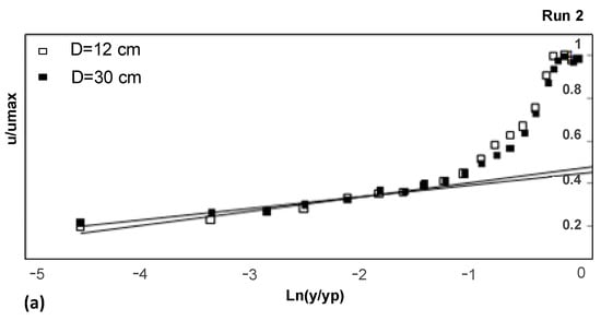 Figure 3 confirms the validity of the log law from the top of vegetation up to y/h = 0.23. The mentioned distance of y/h = 0.23 shows the deviation of the log law from the measured data in y/h > 0.23. This means the data above the bed up to y/h = 0.23 follows the log law distribution and from y/h > 0.23 toward the water surface this law is invalid. The reason for deviation of data from this law is inapplicability of mixing length theory to quasi-uniform flow, and resistance to flow due to vegetation and gravel. In fact, deviation of measured velocity points is due to the effect of pressure gradient changes, the boundary layer thickness, and the maximum velocity In Figure 3a,b the change of gradient is clearly observed, however, in Figure 3c, the deviation point is not clearly observed. The general rule for choice of deviation point of the inner and outer regions of the boundary layer is to use the coefficient of determination (R2) between u/umax and Ln(y/d50) or Ln (y/yp). In this study, the value of R2 ≥ 0.98 in the logarithmic zone was considered as the deviation point where the data are deviated from the log law zone. The value of R2 decreases after the selected deviation point towards the water surface.