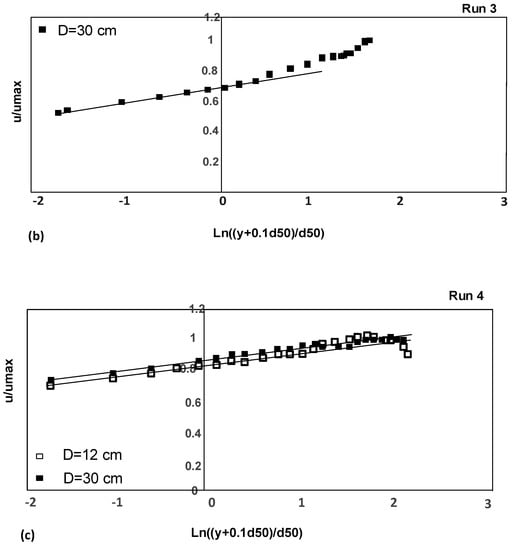 (a) The log-law validation for different conditions for submerged vegetation (run 2). (b,c) The log-law validation for different conditions: (b) for the gravel bed without vegetation in bed and banks in the central axis (run 3); (c) for the emergent vegetation in banks and gravel bed (run 4).