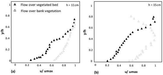 Since the zero Reynolds shear always corresponds to the zero-velocity gradient or maximum velocity, Figure 6 demonstrates that the location of zero RS in the Reynolds stress profiles is superposed with the location of maximum velocity for the flow over submerged vegetation cover. However, for the flow over gravel with vegetation banks, such a superposition is not considered, but it is possible to observe the change of location of zero Reynolds stress with the maximum velocity location with approaching the vegetated banks.
