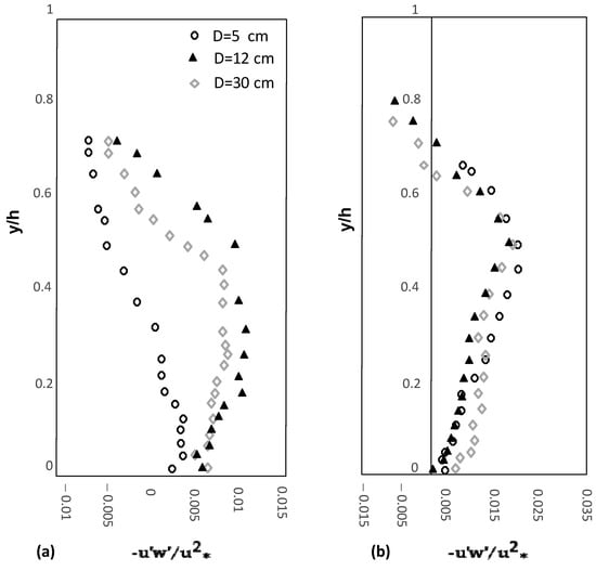 Reynolds stress distributions: (a) for emergent vegetation with gravel bed; (b) over submerged vegetation. (y) is normalized by the total flow depth (h).