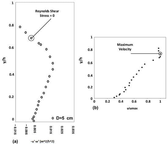 (a) Location of zero Reynolds stress over submerged vegetation cover. (b) Location of maximum point velocity over submerged vegetation cover.
