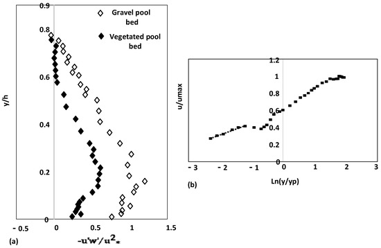 Flow over Pool with submerged vegetation by Parvizi et al. [2]: (a) Distribution of Reynolds shear stress over gravel bed and vegetated canopy; (b) Validation of logarithmic law in vegetated pool.