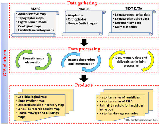We present a multi-level data analysis approach based on a GIS platform to collect various kinds of data useful for landslide risk definition and management. Figure 1 summarizes the workflow of the methodology, which is structured as three steps: data gathering, data processing, and the realization of products.