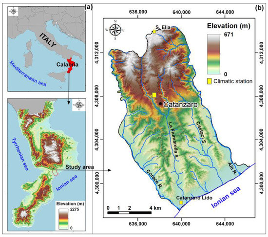 The SA is allocated between 4,314,398 mN and 4,297,473 mN of latitude, and 633,322 mE and 646,315 mE of longitude, and extends over a surface of approximately 111.7 km2. The elevation ranges from 0 to 671 m a.s.l., with an average value of 180 m a.s.l. The SA is delimited by two watercourses, both draining into the Ionian Sea: the Assi River on the left side and the Corace River on the right side (Figure 2b).