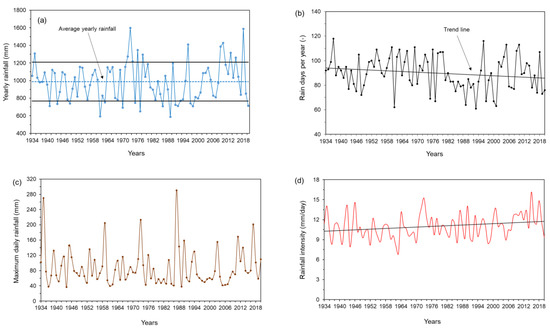 Some characteristics of rainfall data recorded at meteorological station of Catanzaro from 1934 to 2020; (a) average annual rainfall; (b) number of rainy days per year; (c) maximum daily rainfall; (d) rainfall intensity.