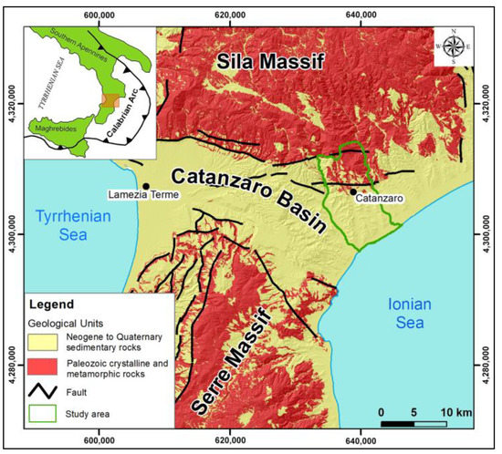 As a geo-structural setting, the SA is situated on the north-eastern edge of the Catanzaro basin (Figure 4) and is the linkage zone between the northern and southern sectors of the mountain belt named the Calabrian Arc [34,36,37,38,39]. The Catanzaro basin, including the SA, is a graben-like structure placed between Sila and Serre Massifs, bordered to the north by NW-SE-trending faults and to the south by a WNW-ESE-oriented fault system [35,38]. This basin is filled by Neogene–Quaternary sedimentary units (Figure 4) consisting of marine and continental deposits, unconformably lying on the Hercynian crystalline-metamorphic units of the Calabrian Arc [37,40,41].