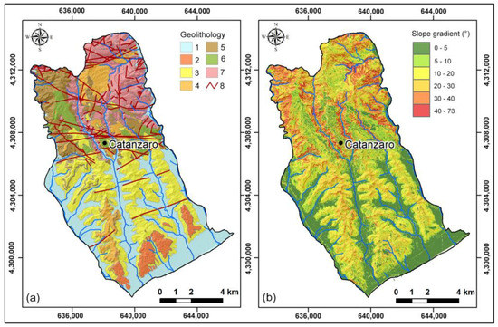 (a) Geo–lithological map of the Catanzaro municipality: (1) Alluvial deposits (Holocene), (2) sand and conglomerate deposits (Pleistocene), (3) silty clay deposits (Pliocene), (4) weak sandstone and sand (Pliocene), (5) conglomerates (Miocene), (6) evaporitic and limestone deposits (Miocene), (7) intrusive and metamorphic rocks (Paleozoic), (8) fault; (b) slope gradient map.