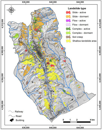 - Landslide inventory carried out by the Regional Basin Authority (Piano di Assetto Idrogeologico—Law 267/98) adopted in 2001 and updated in 2016 (http://geoportale.regione.calabria.it/opendata, accessed on 10 April 2019).