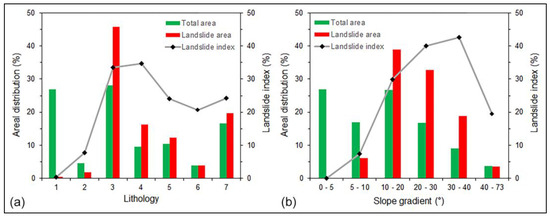 Distribution of total area, landslide area, and landslide index for the (a) lithology types (1. alluvial deposits (Holocene), 2. sand and conglomerate deposits (Pleistocene), 3. silty clay deposits (Pliocene), 4. weak sandstone and sand deposits (Pliocene), 5. conglomerate deposits (Miocene), 6. evaporite limestone deposits (Miocene), and 7. intrusive and metamorphic rocks (Paleozoic); (b) slope gradient classes.
