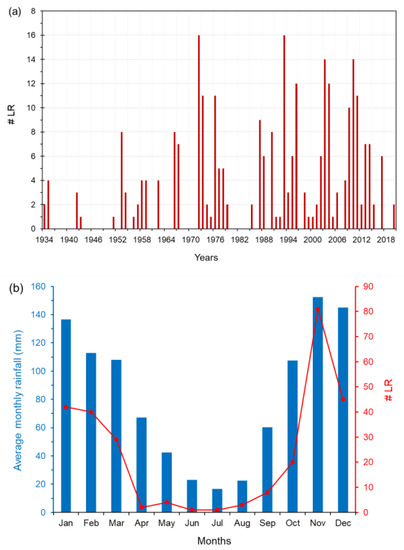 (a) Number of landslide records (#LR) per year in the period of 1934–2020; (b) monthly average rainfall and number of landslide records that occurred from 1934 to 2020.