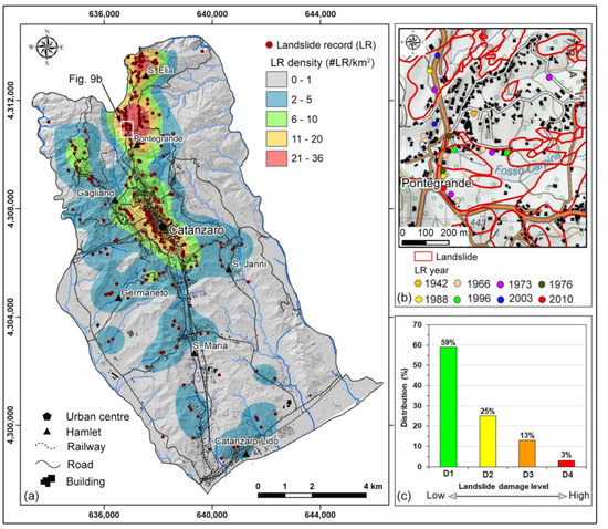 (a) Geo–localization of each landslide record (LR) and LR density map of Catanzaro municipality; (b) example of multiple reactivations of the same landslide; (c) distribution of different landslide damage levels.