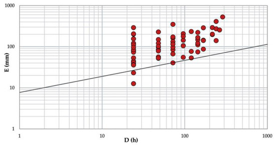 Using a literature approach, we can link the rain duration D (hours) and cumulated event rainfall E (mm), with a 5% exceedance probability, according to the power law (1) [27,28]: