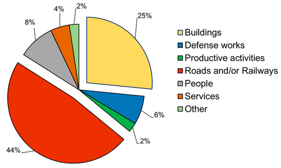 In addition, the descriptions can be used to identify what happened, in terms of damage, during historical LTRs. According to the literature [24,25,26], the damaged elements are sorted into the following macro-groups: roads and/or railways; buildings; people; defense work (such as retaining walls); services (such as water and electric power lines); productive activities (such as industry, commerce, or tourism); and other (to account for elements not included in previous categories). Considering the level of damage, we schematized four severity levels based on the occurrence of the following circumstances: