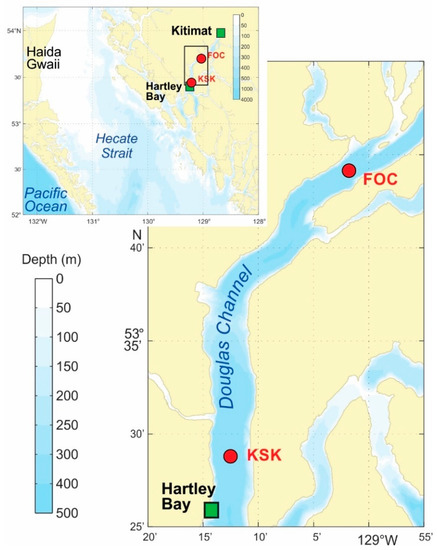 - Wright, C.A.; Vagle, S.; Hannah, C.; Johannessen, S.J. Physical, Chemical and Biological Oceanographic Data Collected in Douglas Channel and the Approaches to Kitimat, June 2013–July 2014; Canadian Data Report of Hydrography and Ocean Sciences; Fisheries and Oceans Canada: Sidney, BC, Canada, 2015; Volume 196, viii+66pp. Available online: http://www.dfo-mpo.gc.ca/Library/359327_pt1.pdf (accessed on 1 November 2021).