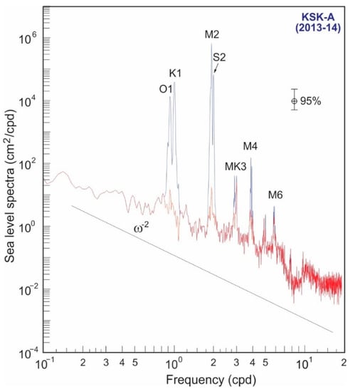 The spectrum of the background oscillations is “red”, with spectral energy gradually decreasing with increasing frequency according to the ω−2 power law. The main property of the spectrum is strong discrete peaks at the frequencies of the major tidal constituents. The spectral peaks associated with semidiurnal tides are predominant, but diurnal peaks are also quite strong. Evident spectral peaks at frequencies of shallow-water high-frequency tidal harmonics (~3, 4, 5, and 6 cycles per lunar day) indicate an important role of nonlinear processes in the formation of the tides in this region.