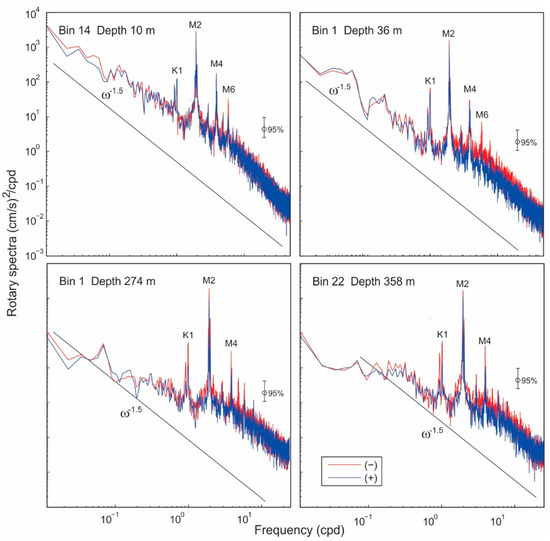 Rotary spectra of currents were recorded at four ADCP depths: 10, 36, 274, and 358 m at Mooring FOC, Deployment A-upper (2013–2014). The red (−) and blue (+) curves are related to the CW and CCW rotary spectra, respectively. The K1, M2, M4, and M6 tidal peaks are denoted, and the power law ω−1.5 is shown by a straight line.