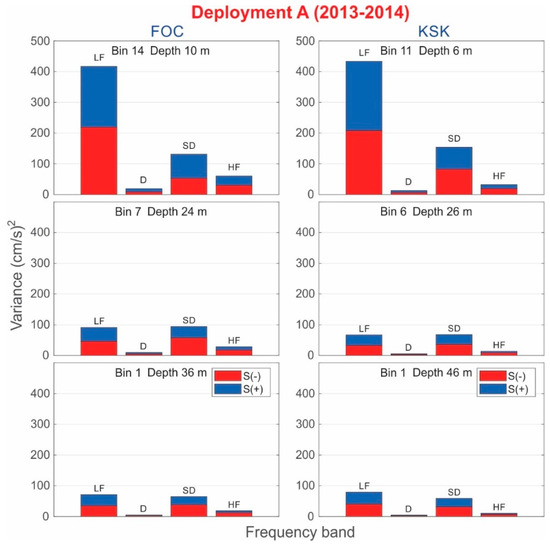 Bar plots (band averaged energy) for the CW (S-) and CCW (S+) rotary spectra at Moorings KSK and FOC, Deployment A (2013–2014). The constructed bars are related to depths 10, 24, and 36 m for FOC and 6, 26, and 46 m for KSK. Bands are low-frequency (LF), diurnal (D), semidiurnal (SD), and high-frequency (HF).
