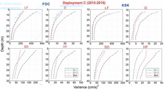 As an example, Figure 4 shows bar plots for three ADCP depth levels at Moorings FOC and KSK, Deployment A. In the uppermost layer about 2/3 of the energy of the currents is related to low-frequency (LF) motions and about 1/4 to semidiurnal (SD) motions. These results for the low-frequency motions are in good agreement with those obtained for this region by Wan et al. [5,6]. They indicated that these motions prevail in the uppermost layers and are mostly induced by estuarine circulation and wind-driven currents. The influence of diurnal (D) and high-frequency (HF) motions is insignificant. At depths of 20–50 m, the relative contribution of LF and SD motions is approximately equal, while at lower depths, semidiurnal currents strongly prevail. At depths larger than 250 m semidiurnal currents are responsible for more than 65–70% of the total variance of the observed currents. The general character of currents and their year-to-year (2013–2016) vertical structure/energy budget remained very consistent.