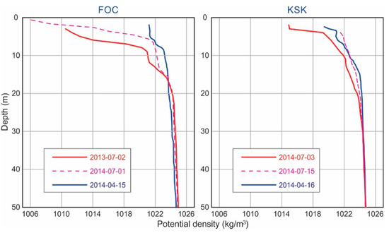 Vertical density profiles at moorings FOC and KSK for three selected spring (blue curves) and summer (red curves) observation periods were estimated based on 2013–2014 cruise CTD data.