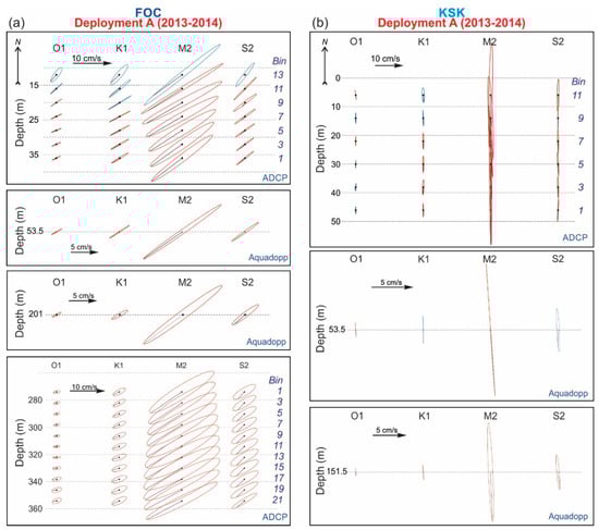 Tidal ellipses for four major diurnal (K1 and O1) and semi-diurnal (M2 andS2) tidal harmonics for moorings (a) FOC (two ADCP instruments, up and down, and two Aquadopps) and (b) KSK (one ADCP up and two Aquadopps), Deployment A (2013–2014). Red ellipses are clockwise (−), and blue ellipses are counterclockwise (+).