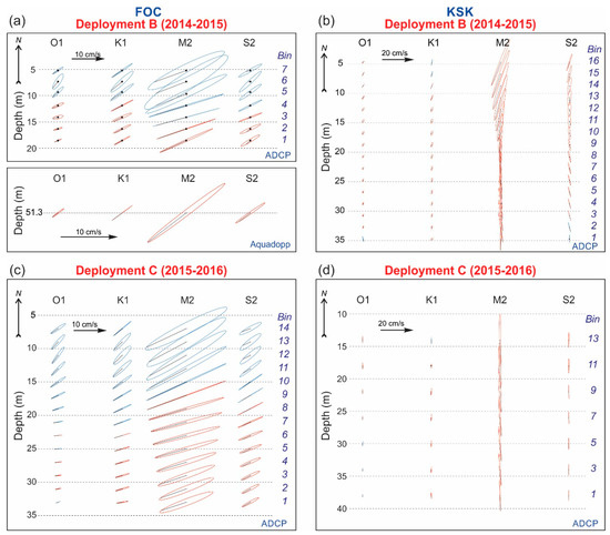 Tidal ellipses for four major diurnal (K1 and O1) and semi-diurnal (M2 and S2) tidal harmonics in the upper 52-m layer for moorings (a) FOC (ADCP up and Aquadopp) and (b) KSK (ADCP up), Deployment B (2014–2015); and (c) FOC (ADCP up) and (d) KSK (ADCP up), Deployment C (2015–2016). Red ellipses are clockwise (−), and blue ellipses are counterclockwise (+).