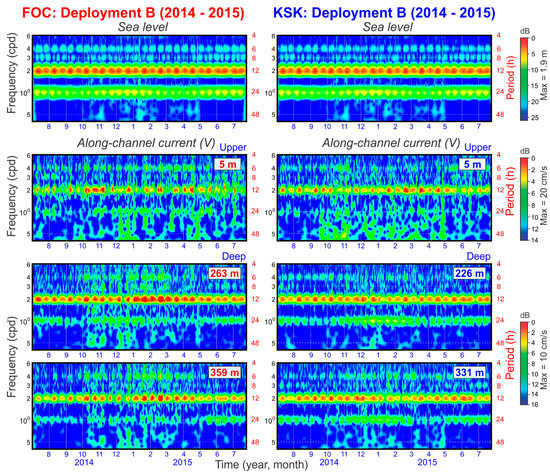 Frequency-time plots (f-t diagrams) for sea-levels (upper plot) and along-channel (V) currents at depths 5 m (upper ADCP), 263 and 359 m at Mooring FOC, and 226 and 331 m at Mooring KSK (lower ADCP) for the second (B) deployment of the instruments (2014–2015). The frequency range is 0.4–6.0 cpd (periods from 2.5 days to 4 h).