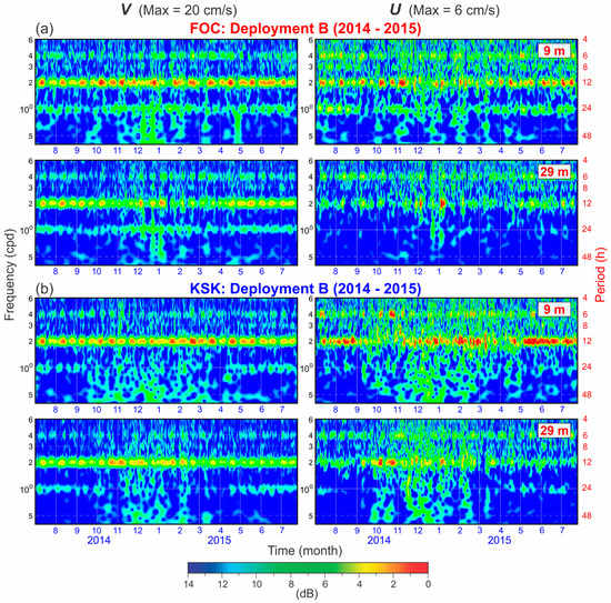 To examine better the SD currents in the upper layer we constructed detailed f-t diagrams both for along-channel (V) and cross-channel (U) current velocity components for all three deployments. In general, there are no marked differences in their f-t diagrams, except that the entire Deployment B at both stations was much more energetic (see Section 3.3) than the two other deployments and had the strongest seasonal contrasts (Figure 10). The FOC and KSK f-t diagrams look similar; intense SD currents were observed in the “winter period” (from November 2014 to May 2015), while much weaker SD currents occurred in the summer of 2014 and in June–July 2015.