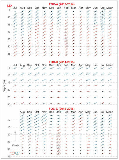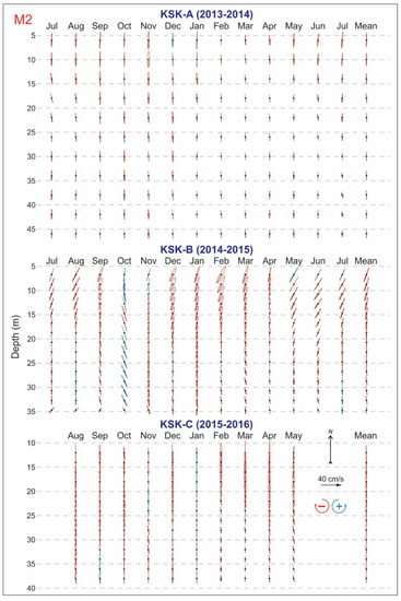 In general, the results of harmonic analysis of tidal currents are in good agreement with the f-t analysis: vertical changes of these currents are smooth and gradual; however, they are strongly variable in time. The temporal (seasonal) variations of currents are more evident at FOC (Figure 11) than at KSK (Figure 12). In the uppermost layer of 5–15 m, counterclockwise (CCW) motions are, in the northern hemisphere, an indication of the baroclinic motions. These CCW motions become stronger and “thicker” (penetrate to deeper layers) deeper in June–August and weaker and “thinner” in the wintertime (Figure 11). The orientation of ellipses is quite steady, except KSK-B (2014–2015) where during the entire year all the M2 tidal ellipses in the 5–15 m layer are oriented in the NW-SE direction. Month-to-month changes in shapes and sizes of the recorded ellipses at both moorings are gradual and regular; at the same time, the seasonal changes in these ellipses are not consistent and for the same months in different years do not always look alike.