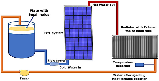 A PV module’s electrical efficiency drops by 0.5% with each increase of 1 °C in the module’s temperature above 25 °C [5]. Different substances are employed to cool down PV modules, such as water, air, phase change material (PCM), and nanoparticles, which transfer heat from the PV panel. However, thermal energy can also be collected for other purposes, such as space and water heating. Dubey and Tiwari [6] analyzed the thermal energy, electrical energy, and exergy of a PV/T/Water system by changing the shape and size of the collectors (sheets and tubes). They concluded that partially sheltered PV cells are advantageous for those customers who want hot water production as their first choice and electrical generation first choice using fully covered PV cells. Huang et al. [7] examined the effect of phase change materials on the cooling of a PV/T system and concluded that convection and crystalline isolation impacted heat transfer efficiency. Yousefi et al. [8] studied the effect of Al2O3/water-based nano-fluid on flat-plate solar collectors and found that at a concentration of 0.2 wt.%, the efficiency increased by 28.3%, which was greater than the efficiency obtained at a 0.4 wt.% concentration.