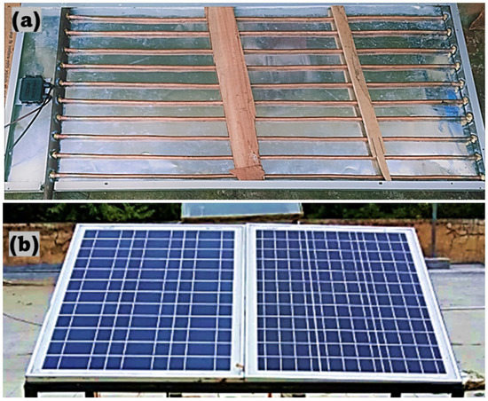 The heat accumulated at the back of the PV panel is extracted and used for water heating, which can be used for space heating and other household applications. A copper pipe with a circular shape and an inner diameter of 10 mm is attached to the backside of the PV module and covered with a foam sheet measuring 53.5 inches × 26.5 inches × 0.8 inches, as shown in Figure 3a. The copper pipe has ten straight turns connected with the common iron pipe of 24.5 mm. The attached copper tube PV module and the unmodified PV module are shown in Figure 3b.