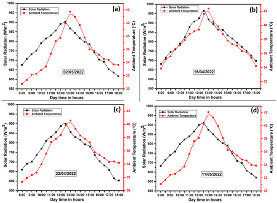 An experimental set-up was fabricated and installed on the roof of the academic building at KNIT, Sultanpur. Experimental data were recorded from 15 April 2022 to 15 May 2022, between 8:00 a.m. and 6:00 p.m. The 1–2, 1–3, 1–4, and 1–5 pairs of experimental cases were recorded on four different days with clear skies and the assumption of no significant difference in atmospheric conditions (ambient temperature and solar energy). The average values of different parameters for case 1 are compared with the similar parameters for cases 2, 3, 4, and 5 at a flow rate of 3 LPM for the working fluid. The investigation was repeated for three additional four-day for flow rates (6, 9, and 12 LPM). Ambient data was recorded for one month, and solar radiation and ambient temperatures were plotted for four arbitrary days with daytime shown in Figure 5a–d. The peak solar radiation and ambient temperature were recorded between 11:30 a.m. and 1:30 p.m. Solar radiation increased until between 12:00 and 1:30 p.m. and then began to decline. The maximum incident solar intensity on the PV and PVT was between 898 W/m² and 964 W/m². The highest ambient temperature recorded was 42.5 °C.